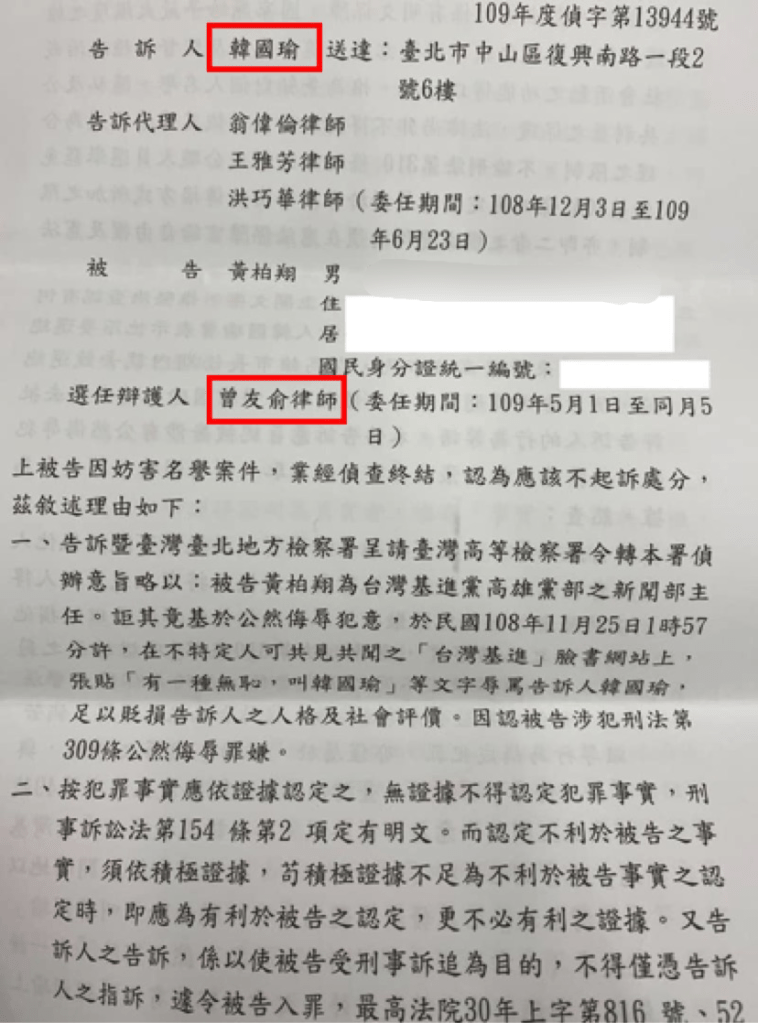而被告之言論發表期在告訴人擔任高雄市長並參選總統之時,後者的品格、操守以及行政能力應受輿論高度監督,民主社墜翁質疑民選政治人物的能力險與公眾事務相關而有高度公益性質而為可受公評之事,不起訴處分書內容提到:「尤其在本件被告言論內容中,可認被告係以『無恥』批評告訴人發表『不曾落跑』、『高雄已經崛起而可與台北分庭抗禮』等言論,屬對於告訴人品格、施政能力之批評,以告訴人時任高雄市長並參選總統之身份而言,對於攸關我國總統、地方首長政治行為之評論,顯均為言論自由保障之核心範圍,是本件判斷被告是否為合理評論,應以最為寬鬆之標準審查,以免日後他人監督、評論政治活動之言論,動輒得咎,而產生寒蟬效應。」