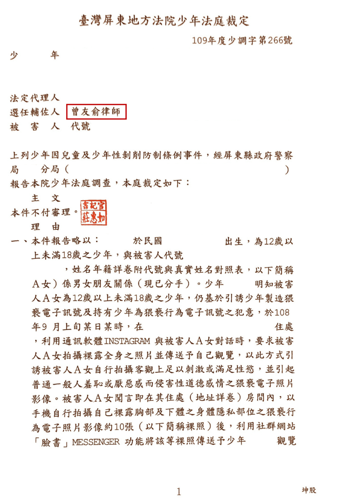 本次案件是屏東地方法院109年度少調字第266號,獲得相當於一般刑事訴訟無罪判決的不付審理處分(無保護處分原因或必要性),而因為這案件是少年案件(12-18歲),也就會適用少年事件處理法。