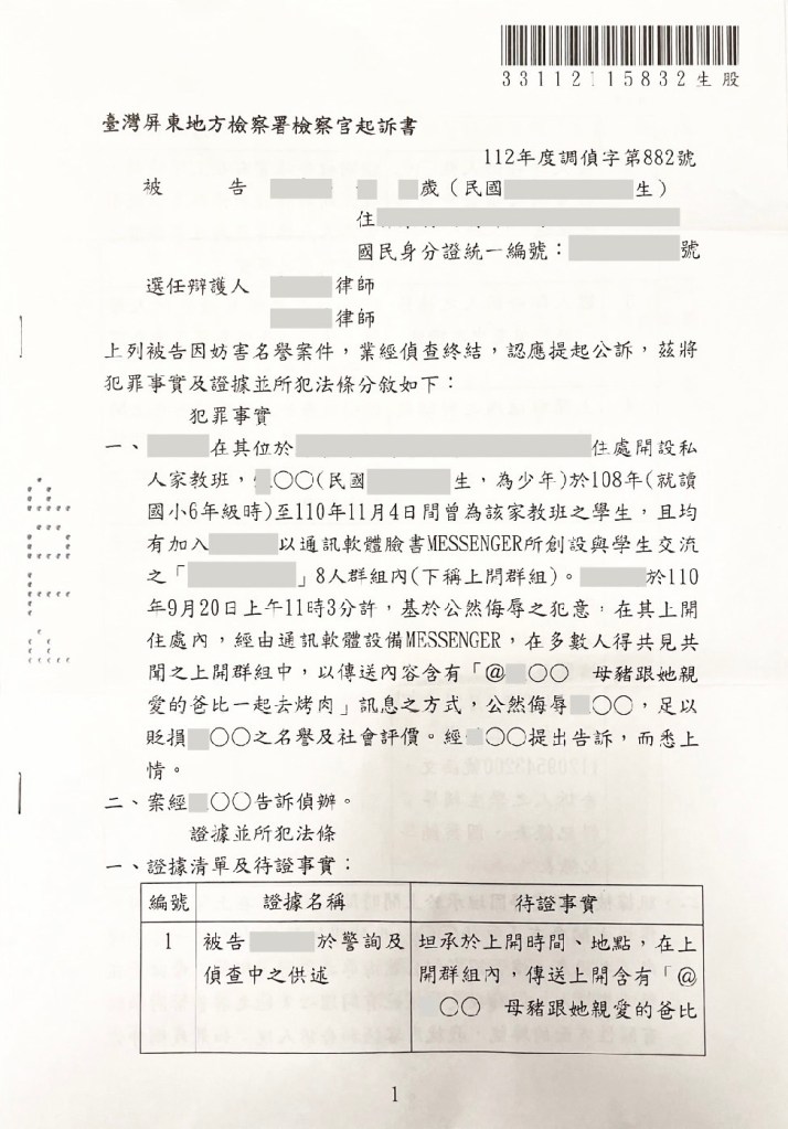 本案被告為補習班教師,告訴人則為中學生,被告在包括告訴人以及其他學生在內的通訊軟體群組發送:「@○○○ 母豬跟她親愛的爸比一起去烤肉」的訊息,經屏東地檢署以公然侮辱罪提起公訴。